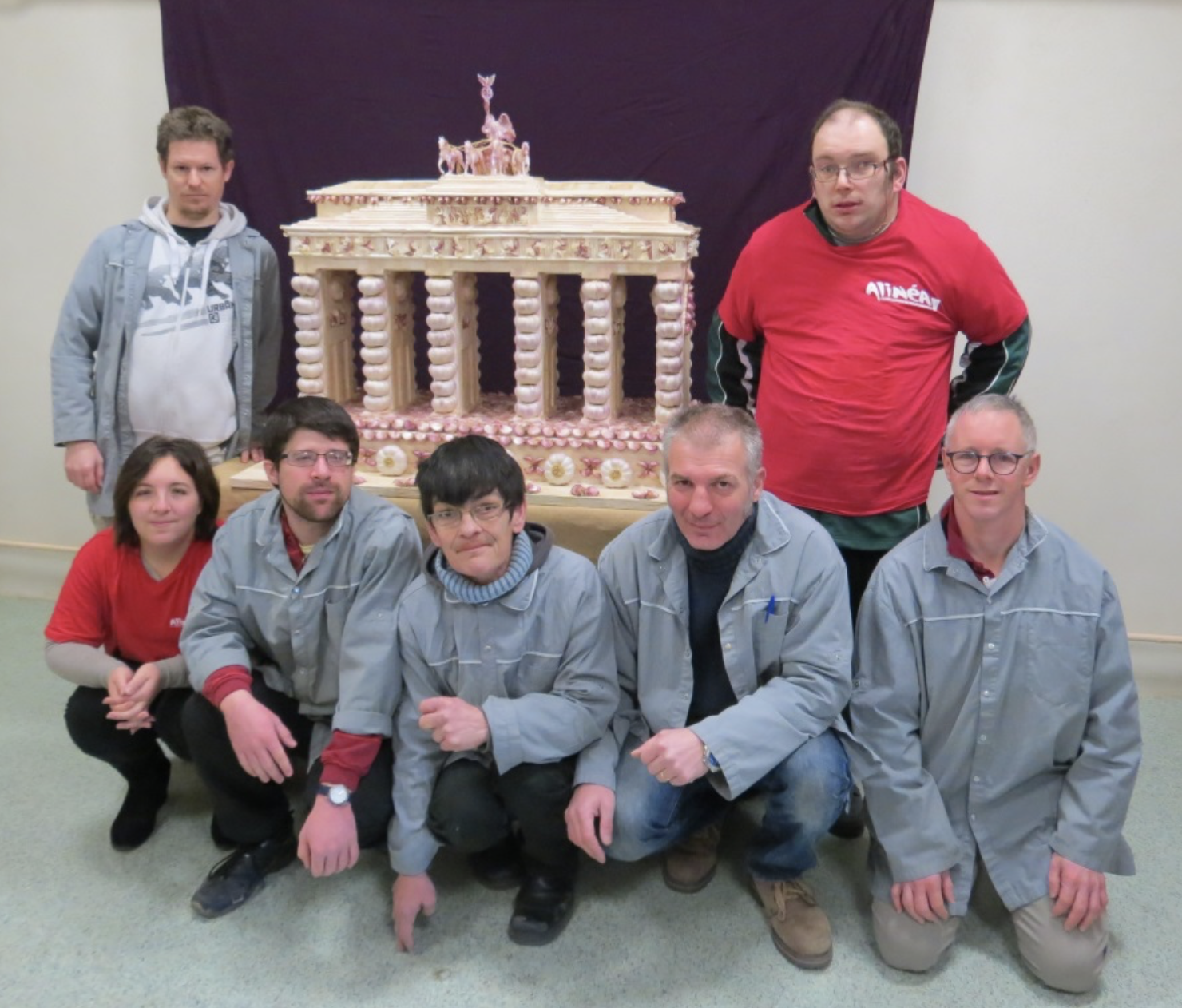 Sept travailleurs de l’ESAT de Braconnac-les-Ormes (Tarn) ont réalisé une Porte de Brandebourg à partir d’ail rose de Lautrec, pour le salon international de l’agro-alimentaire